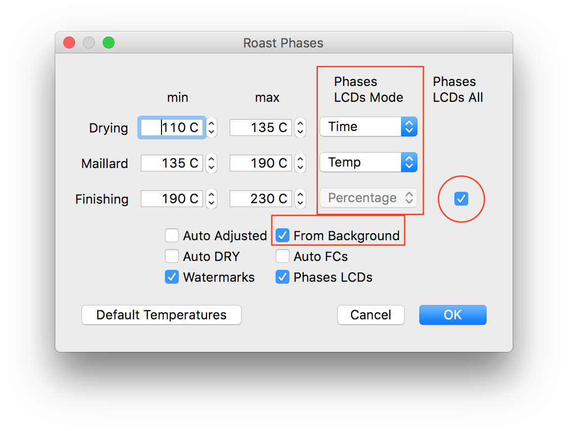 The phases setup got simplified by reducing the number of manual roast phase settings from two (Espresso and Filter) to just one. At the same time it is now possible in the Roast Phases dialog (menu Config >> Phases) to define the display mode (Time, Percentage or Temperature) to be used on entering any of the three phases.